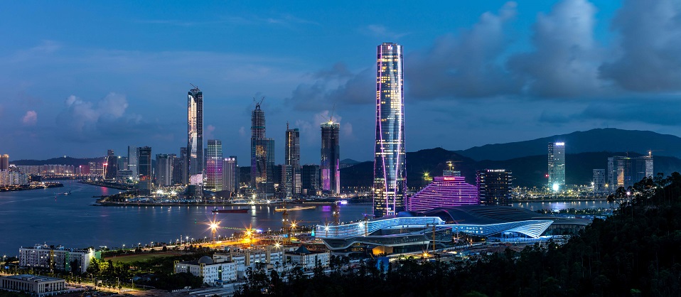 由上海宝冶承建的深圳珠海十字门中央商务区项目位于珠海市香洲区,与澳门隔河相望,背山面水,山海城共生,生态资源优越,是国内为数不多的集展览、会议、剧院、酒店、商务、旅游为一体的大型公共高端综合体建筑群。塔楼建筑面积约14.6万平方米,建筑高度330米,是当时珠澳第一高楼。